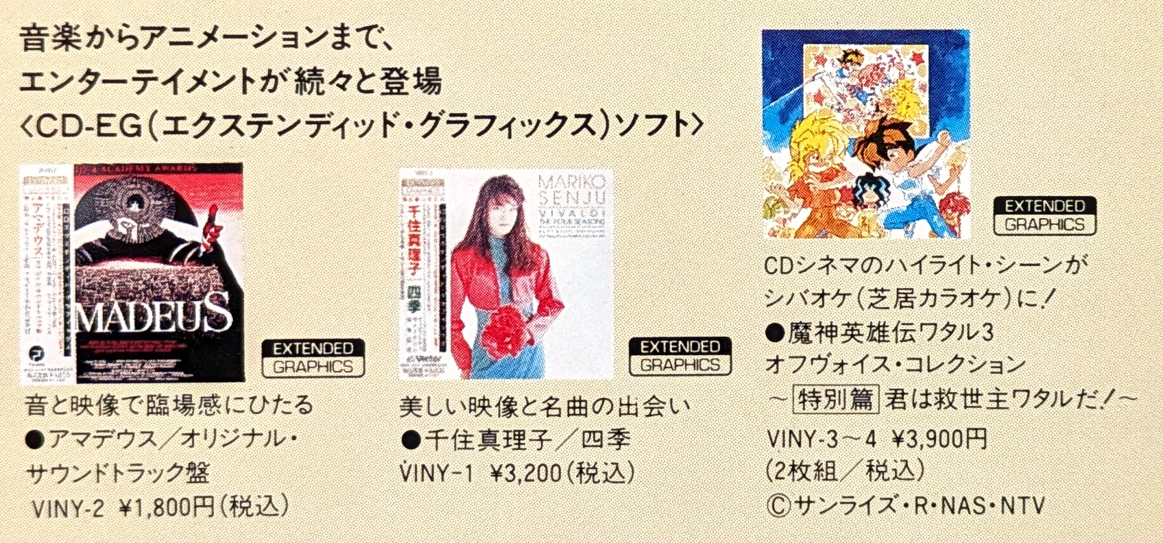 There are 3 known retail CD+EG releases, all with VINY catalog numbers. The last is VINY-3~4, released in late 1992. They were shown together alongside decoders until at least mid-1994.